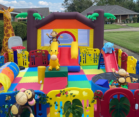 Soft Play and Inflatable bounce house can be used for several different theme parties and events such as paw patrol, super mario, mickey mouse clubhouse, jungle, dinosaurs, Cocomelon and more! *PLEASE READ FULL DESCRIPTION INCLUDING EXAMPLE PURCHASE PROCESS BELOW!* You will receive the following: 12x10 Play Area Floor Mats Ball Pit Slide Jumbo Blocks Large Soft Climber Tunnel Bouncy Animals x2 Bubble Machine Basketball Goal Giant Connect 4 Bounce and Spin Bumper Cars x2 (yellow & red) Toddler Inflatable of choice Full Size Inflatable (Yellow Multicolored) 1 Concession Machine & Supplies for 8 (cotton candy) Available Toddler Inflatable Themes: Primary Rainbow Jungle *Rental period is 4 hours. The latest pick up time is at 7:00pm unless different time arrangements are requested. 4 hour rental period begins at time of your event not at drop off time. FULL BALANCE MUST BE PAID 24 HOURS BEFORE EVENT VIA INVOICE SENT TO YOUR EMAIL! **A $50 non-refundable deposit to hold your date is required and will go to the cost of rental. An additional damage deposit of $100 is also required and signed waiver to confirm booking. Damage deposit is refundable after inspection of equipment and is in good working order. Up to $100 of deposit will be forfeited if equipment is excessively dirty, wet, damaged, or broken. Extra fees my apply if damaged or broken to repair or replace equipment and must be paid in 7 days from rental start date. In cases of bad weather rentals can be transferred to another day based on availability. Example: You want to rent this package. Package total price is $600. To secure your date you will pay a $50 non-refundable deposit to save your date and $100 damage deposit which is $150 total due today at checkout. $50 non-refundable deposit will go to the cost of your rental leaving you to pay the remaining balance of your rental $550. At this point you will have paid $700. Once your rental period is over and equipment is picked up and no damage is observed your $100 damage deposit will be refunded meaning you will have paid the package total of $600. PLEASE REMEMBER TOTAL THAT IS SENT VIA INVOICE IS THE CORRECT TOTAL. THE TOTAL ON CONFIRMATION EMAIL MAY NOT BE CORRECT DUE TO DELIVERY FEES, ADD-ONS ETC!